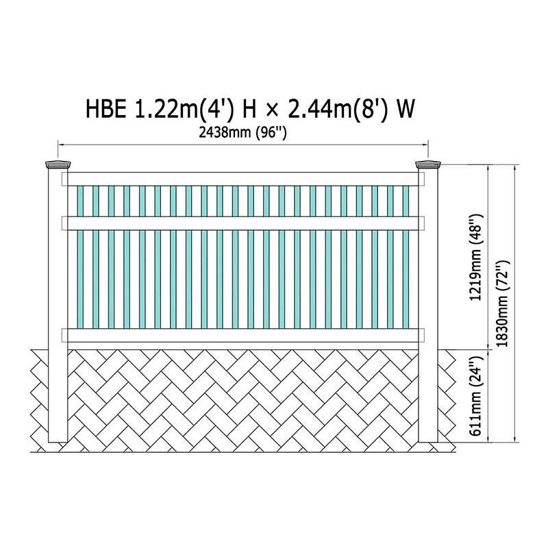 Za dodatnu komercijalnu čvrstoću, svaka donja šina uključuje aluminijski umetak, pružajući dodatnu podršku tamo gdje je najvažnija. Piketi, koji mjere 1 1/2 "x 1 1/2" x 40 ", instalirani su sa standardnim razmakom, osiguravajući sigurnost bez narušavanja vidljivosti.