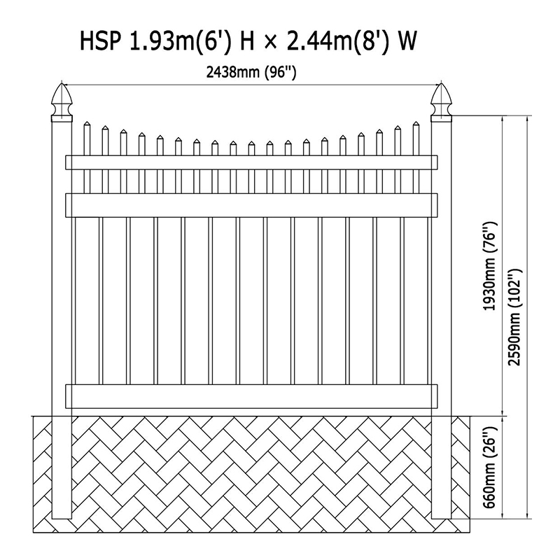 Ograda je standardnu visinu od 72 inča, pružajući idealnu ravnotežu između vidljivosti i osamljenosti. Za one koji imaju specifične potrebe, nudimo razne visine i širine, osiguravajući da vam se savršeno uklapa u svoje imanje. Svaki odjeljak mjeri standardnu širinu od 96 inča, s dostupnim mogućnostima prilagodbe u skladu s vašim zahtjevima projekta.